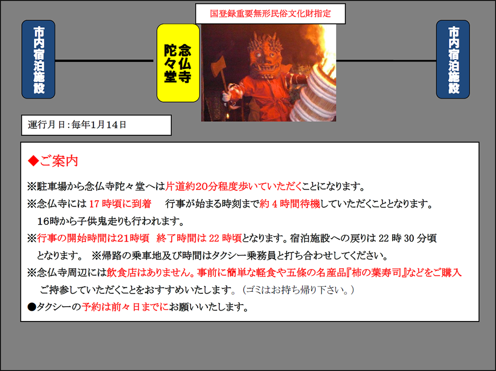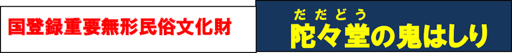 500 年の歴史を誇る伝統行事。 燃えさかる松明を振りかざした三匹の鬼が堂内で住民の災厄を払います。行事は 松明を先頭に行者たちが陀々堂に入堂し、鐘の音を合図に始まります。
